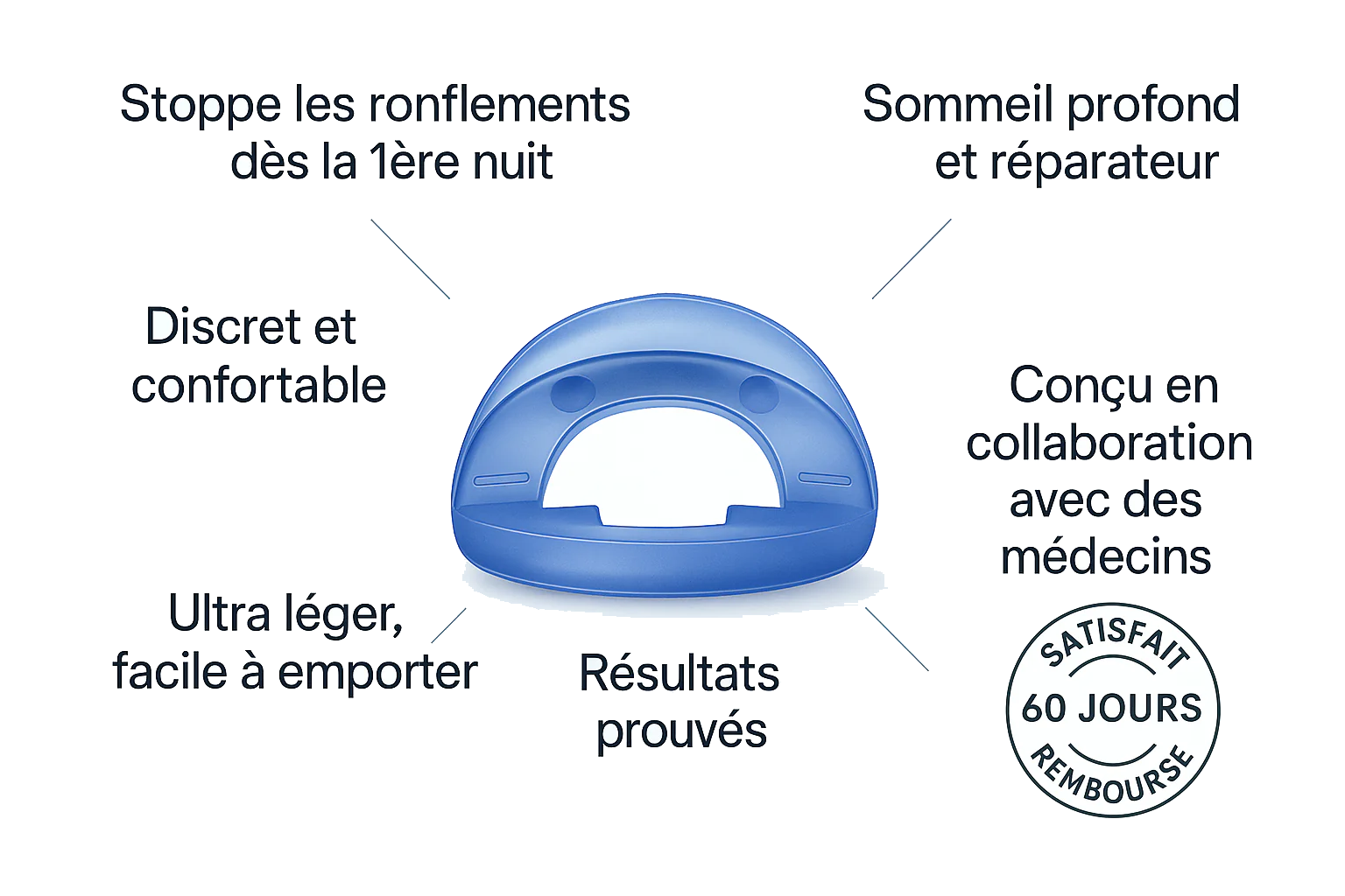 Dormy résout ce problème mécaniquement : il déplace doucement la mâchoire vers l'avant de 3 à 5 mm → la langue reste en place → les voies respiratoires sont ouvertes → l'air circule librement → silence .